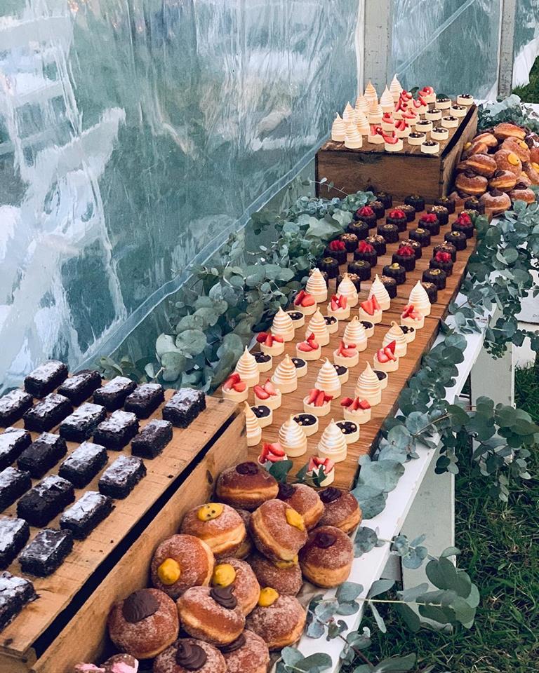 Looking to sweeten up your event? Add a sweet station grazing table! Featuring an assortment of mini tarts (citrus, caramel, chocolate), rocky road, brownie bites, delicious filled doughnuts and other chocolate elements.