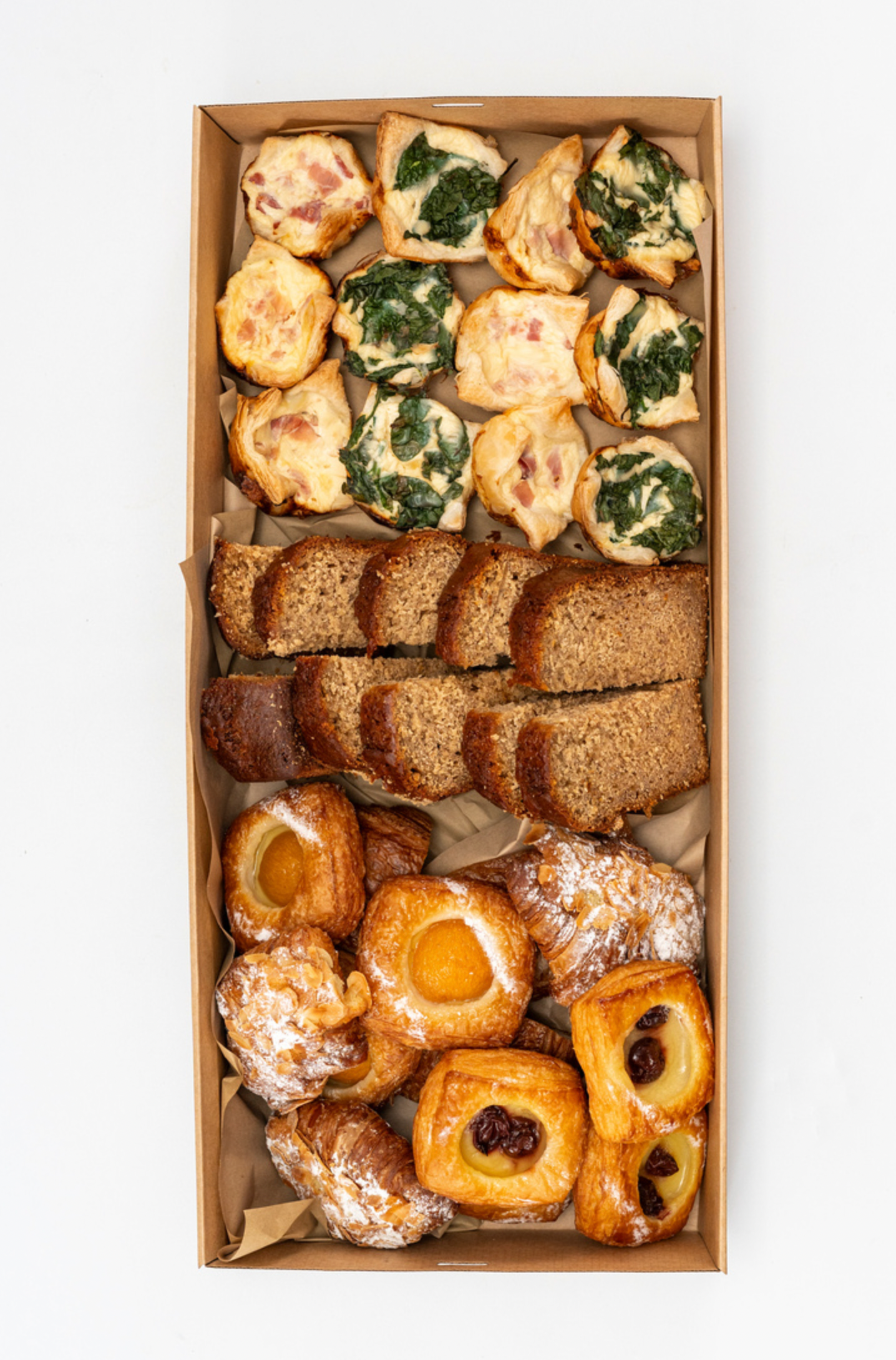 Featuring mini quiche (Cheese & Bacon / Spinach & Feta), banana bread and assorted petite pastries including mini danishes, chocolate and traditional croissants.