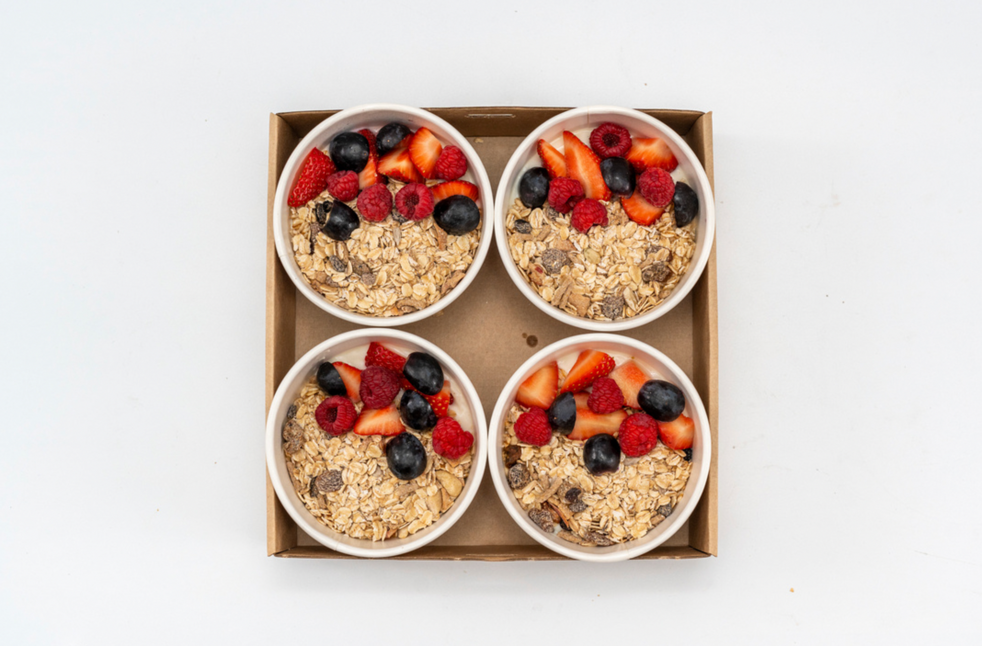 Yoghurt & muesli pots topped with fresh seasonal fruit