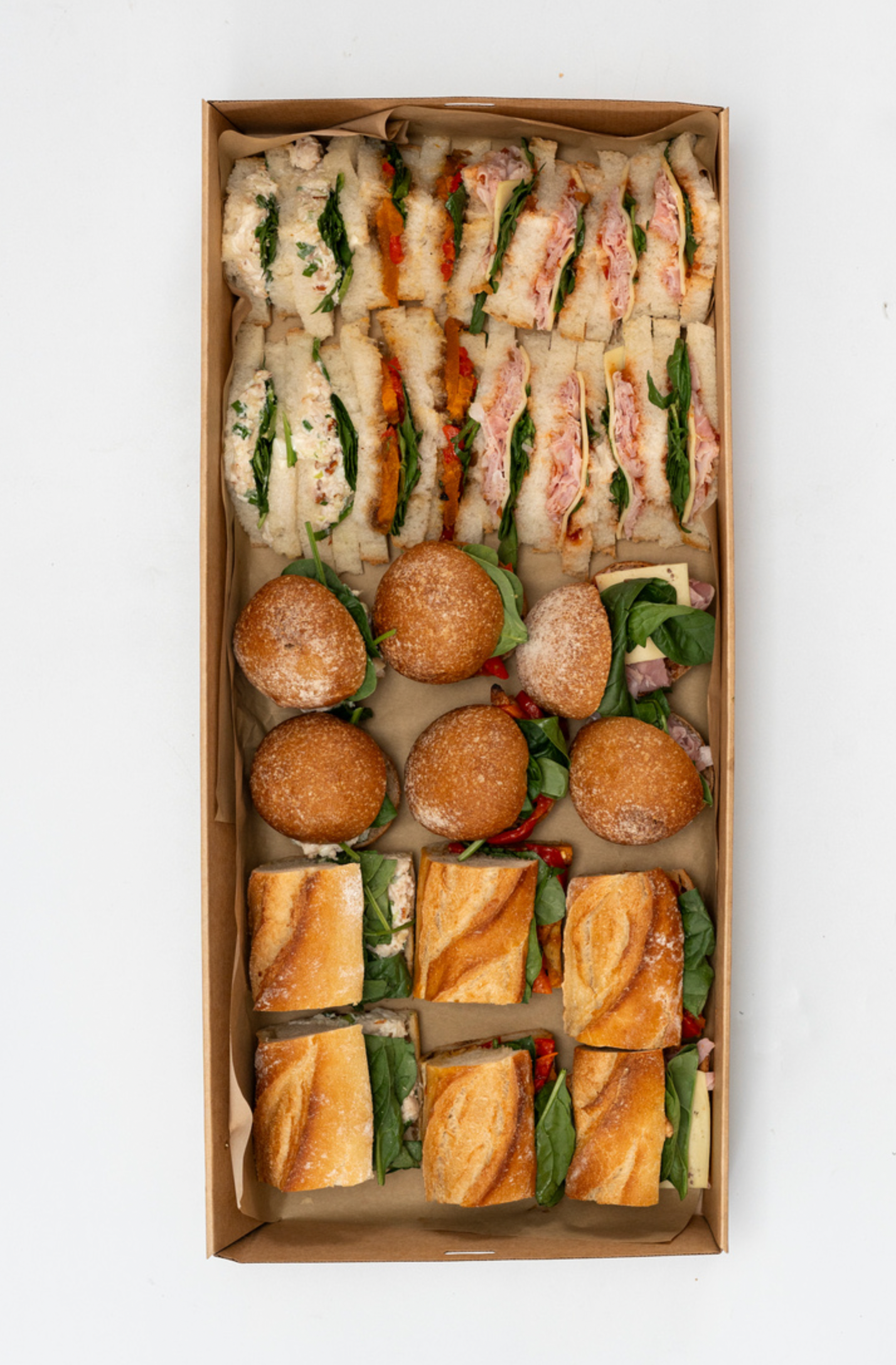 A mix of baguettes, rolls and triangle sandwiches for your lunch time spread!